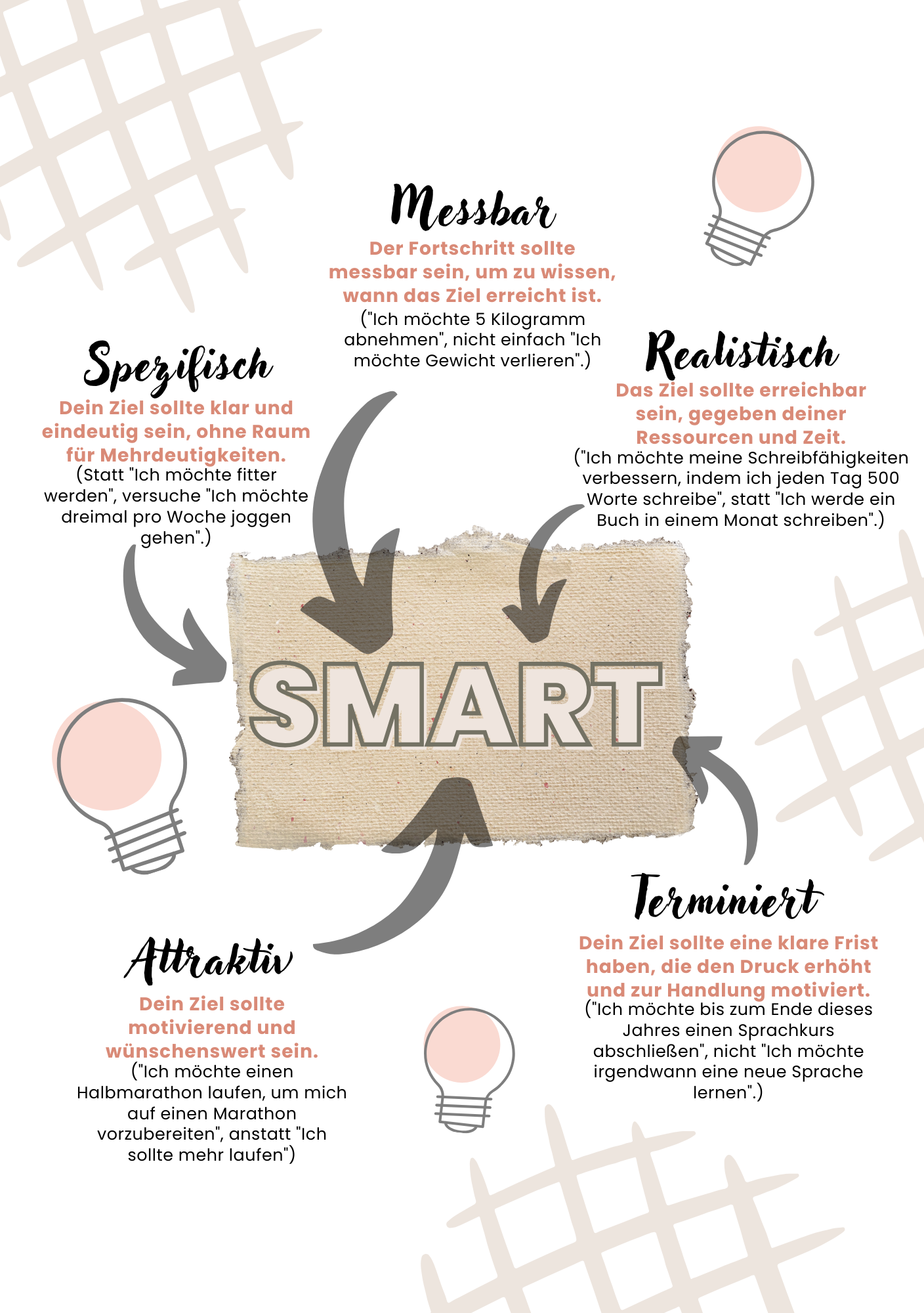 Jetzt, wo du dein spezifisches Ziel und alle relevanten Details dazu festgelegt hast, ist der nächste Schritt, dieses Ziel mit der SMART-Technik weiter zu verfeinern. Diese Methode hilft dir, aus einem allgemeinen Wunsch ein klar definiertes, erreichbares Ziel zu machen.